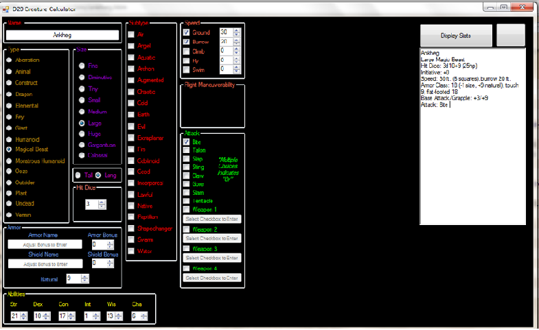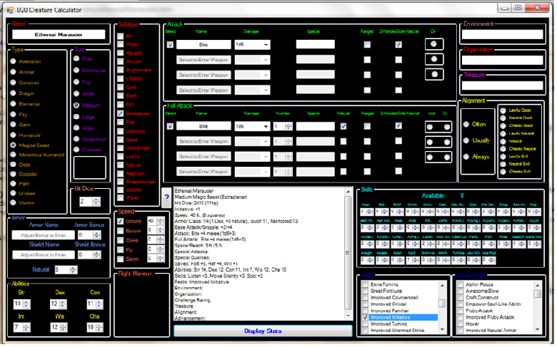 The hp, damage, attack, saves, ac, and soon everything else is calculated for you after just a few selections. I now have to decide just how many feats I want to consider (I mean do I really have to code every Skill Focus Feat?) |