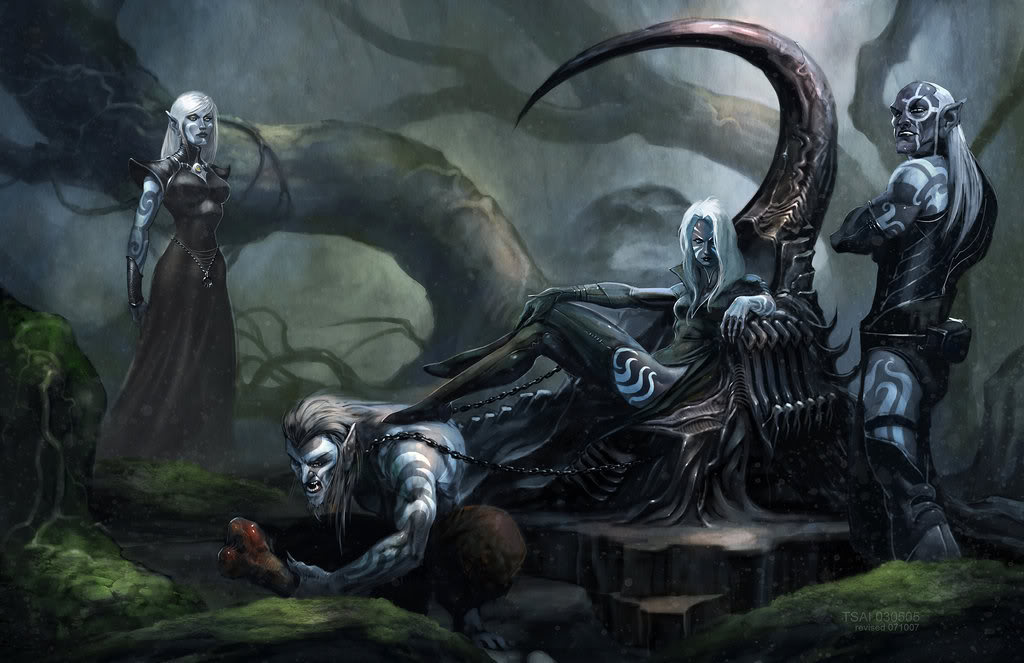 | Albino drow is an interesting concept. I could see them as some sort of feral savages or even as a cultured society that looks down on even their dark skinned brethren as mere cattle weak imitations of what a real drow is. I think there is a scroll somewhere in the keep that references House Starym as a version of Ed's albino elves. I wonder what albino drow would worship. Moander AND the Seldarine maybe? |