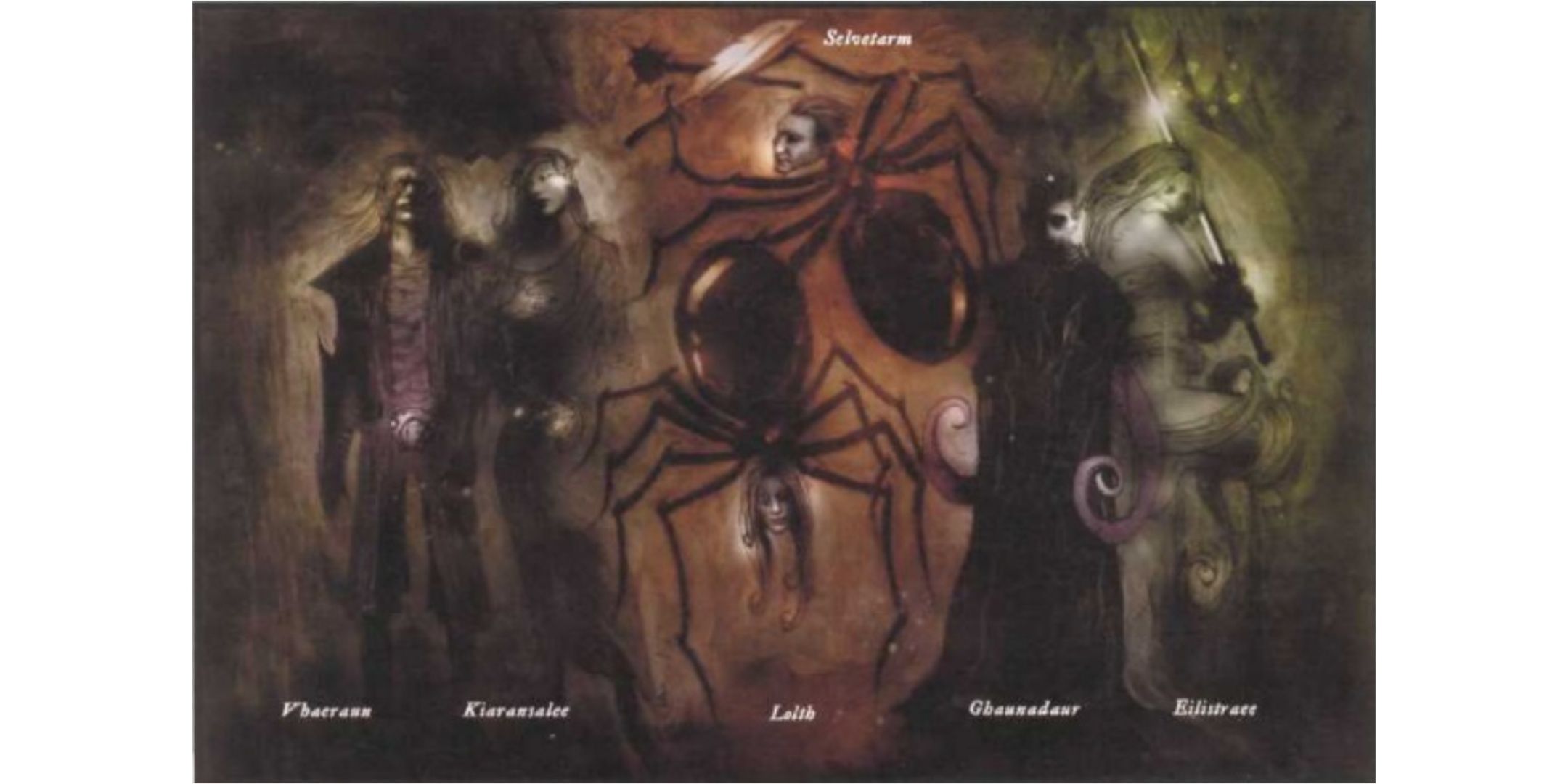 [Alternative Path] Ghaunadaur is included in the Dark Seladrine in this classic art piece. I do not treat the Elder Eye as a mere sylvan lord, but if he posed as one for a time he may have had a child. Any LeShay who courted him must have been absolutely mad.. https://static0.thegamerimages.com/wordpress/wp-content/uploads/2024/05/dark-seldarine-d-d.jpg